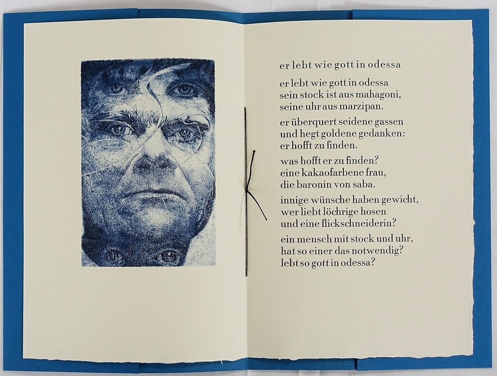 30 x 20.5 cm. With one original color etching by Hubert Sommerauer. Blue original brochure with title imprint. - XL single-sheet print from Bear Press in Ratio Latin. First printing, published on October 6, 1993, in Berlin. One of 120 numbered copies. The printing imprint is signed by the artist. In perfect condition.