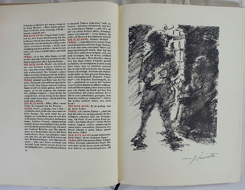 35 x 26 cm & 42 x 30 cm. 103 pages printed throughout in red and black. With 12 original lithographs by Lovis Corinth, including the full-length images (7) signed. Original parchment binding with spine and cover titles, gilt-edged head. (Binding by E. A. Enders). One of 50 numbered copies of this absolute deluxe edition. With an additional suite in which all original lithographs were signed by the artist. Schiller's "The Robbers" was published as the 31st Avalun print in an expressionist typeface designed by Georg Mendelssohn. Corinth accompanies the stormy visions of freedom and the passionately aglow dramatic language of the young Schiller in his full-page lithographs. The imprint is signed by Lovis Corinth. A flawless copy in a linen case. - Rodenberg 337. - Müller 797-808.