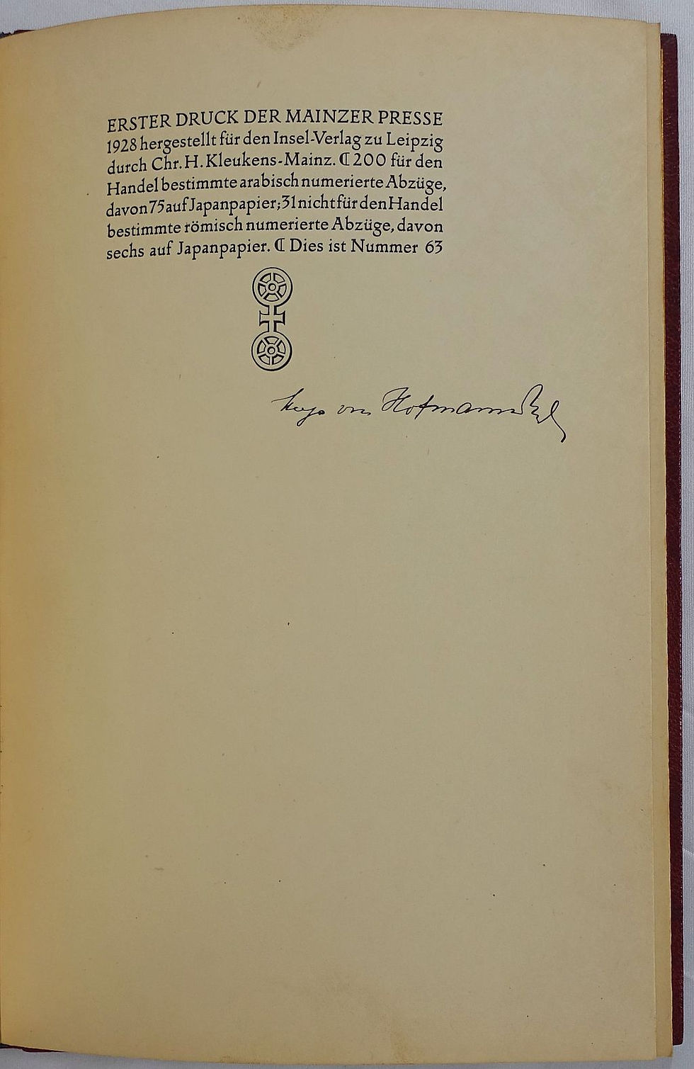 26 x 17 cm. 95 pages. Hand-bound original morocco binding with spine title, embossed title, and gilt head edge. (Signed Gerhard Prade, Leipzig). - 1st printing by the Mainzer Presse, produced in 1928 for Insel Verlag in Leipzig. Published in the year of the first edition and premiere. One of 75 numbered copies of the special edition on Japanese paper in hand-bound morocco. The publisher's imprint is personally signed by Hugo von Hofmannsthal. Immaculately preserved. - Rodenberg 511. - Sarkowski 758.