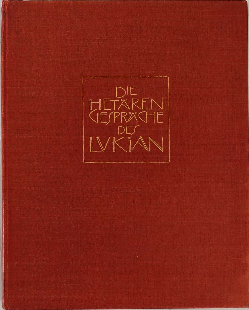 German by Franz Blei. With fifteen pictures by Gustav Klimt. Folio. 36 pages. Original red cloth binding with front cover title and gilt head edge. One of 450 numbered copies, printed throughout in two colors in gold and black. With 15 full-page erotic plates based on drawings by Gustav Klimt. Lucian's Hetaerae Conversations are among the artist's most beautiful books. Immaculately preserved. - Hayn/Gotendorf, Vol. IV, 294.