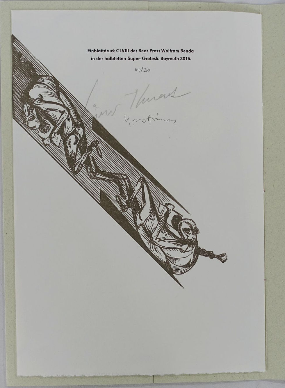 30 x 20.5 cm. With four color original woodcuts by Karl-Georg Hirsch. Light gray original softcover with title imprint. - Bear Press CLVIII single-sheet print in medium-bold Super-Grotesk. One of 50 numbered copies. The imprint is signed by the artist and author. In perfect condition.