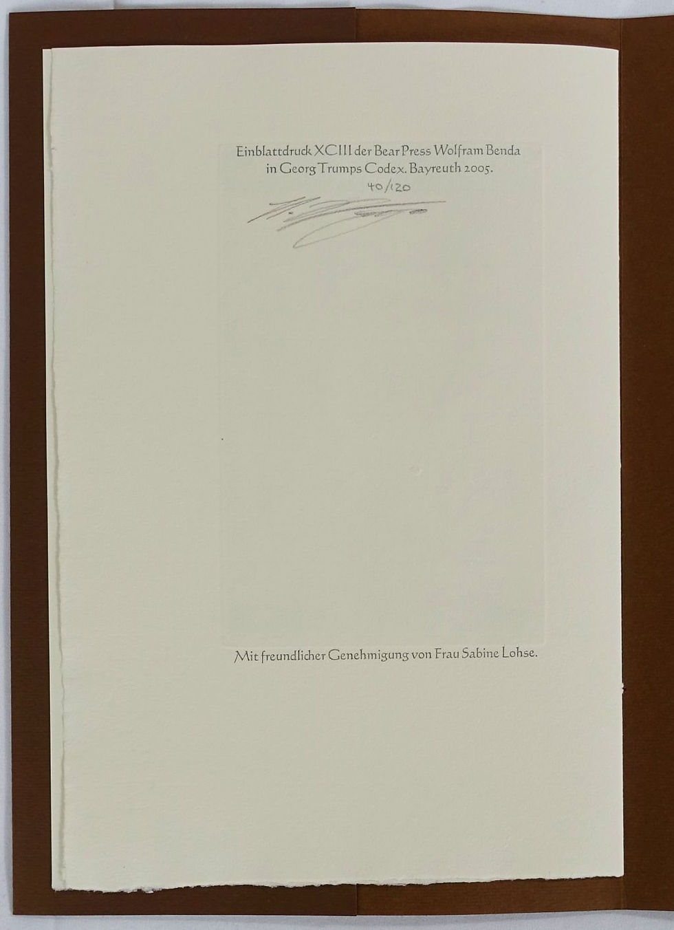30 x 20.5 cm. With one original color etching by Stephan Klenner-Otto. Brown original softcover with title page. - Bear Press flyleaf XCIII in Georg Trump's Codex. Printed in 120 numbered copies. The imprint is signed by the artist. In perfect condition.