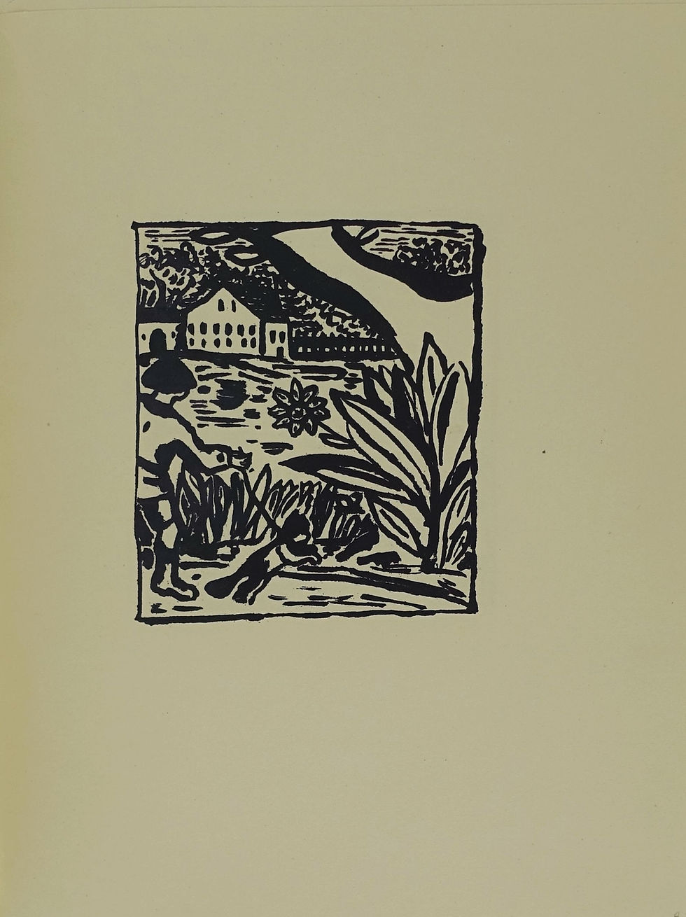 24.7 x 19.5 cm. 13 pages and 40 plates by Balthusz. Revorim binding by Jean de Gonet with bound original softcover. Black hard rubber boards with brick-like embossing, front board with inlaid embossed leather panels, one with title. Gray leather spine in three panels, leaving the red binding strips exposed, embossed spine title, suede insert. Inserted in a black cardboard cover with spine title and slipcase. (Signed: Jean de Gonet Paris 1986). - First edition of the first known work by the then thirteen-year-old Balthazar Klossowski de Rola (1908-2001), with a foreword by his mentor and godfather Rainer Maria Rilke, who had been friends and romantically involved with Balthusz's mother, the painter Elizabeth Dorothea Spiro (1886-1969), known as Baladine, since 1919. The original drawings, which the artist claimed were in Rilke's possession, are lost. The pretitle features a handwritten dedication by Balthusz to a friend, dated January 30, 1991. In a master binding by Jean de Gonet. Immaculately preserved. - Ritzer E 36. - Mises 225.